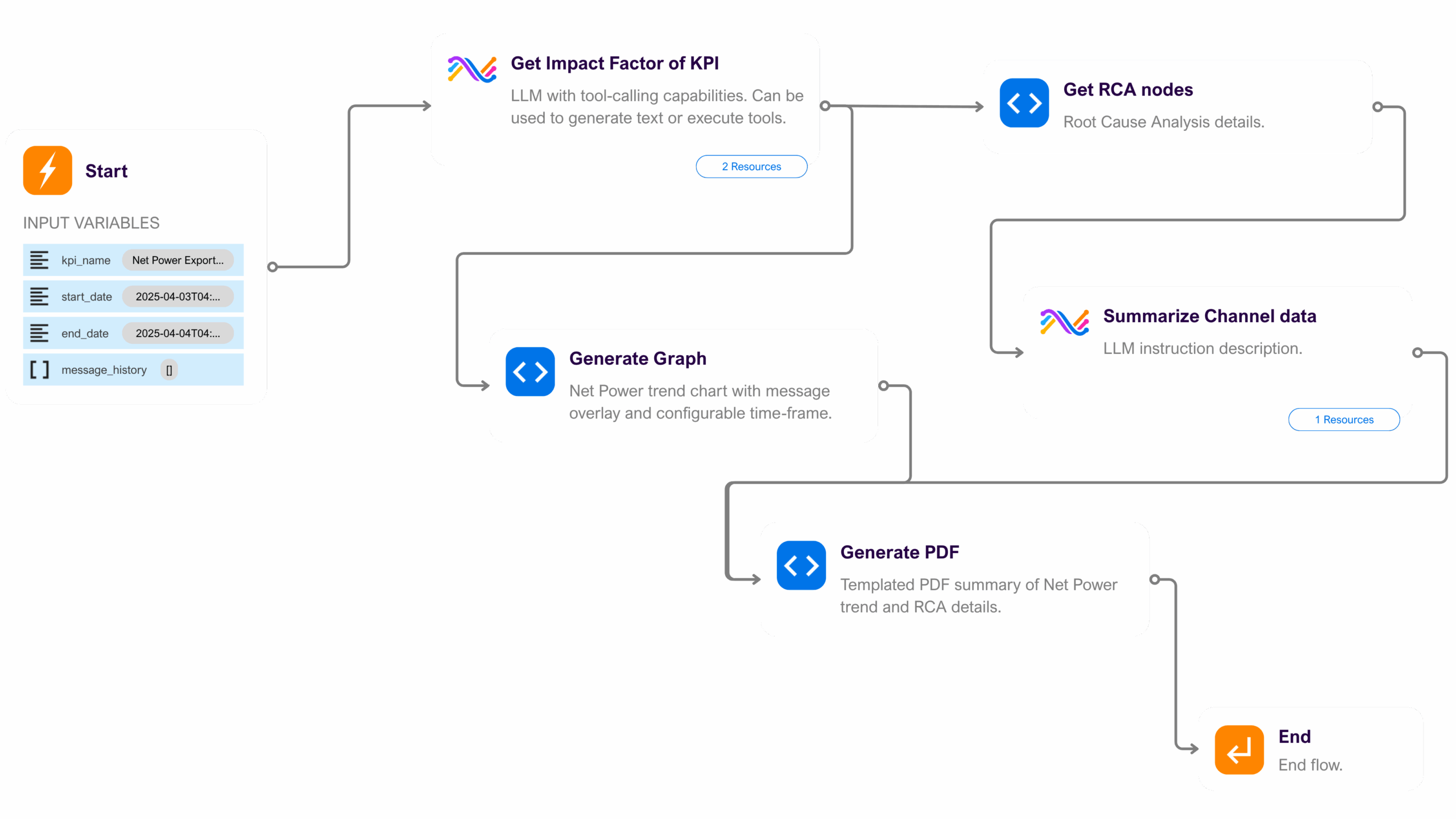 IRIS Flows permite a los agentes trabajar juntos, formando redes adaptativas que resuelven escenarios complejos. Por ejemplo, cuando se detecta una desviación de los KPI, un agente de causa raíz inicia una investigación, un agente de modelado de escenarios evalúa los resultados y un agente de revisión por expertos coordina la toma de decisiones humanas, todo ello sin fisuras.