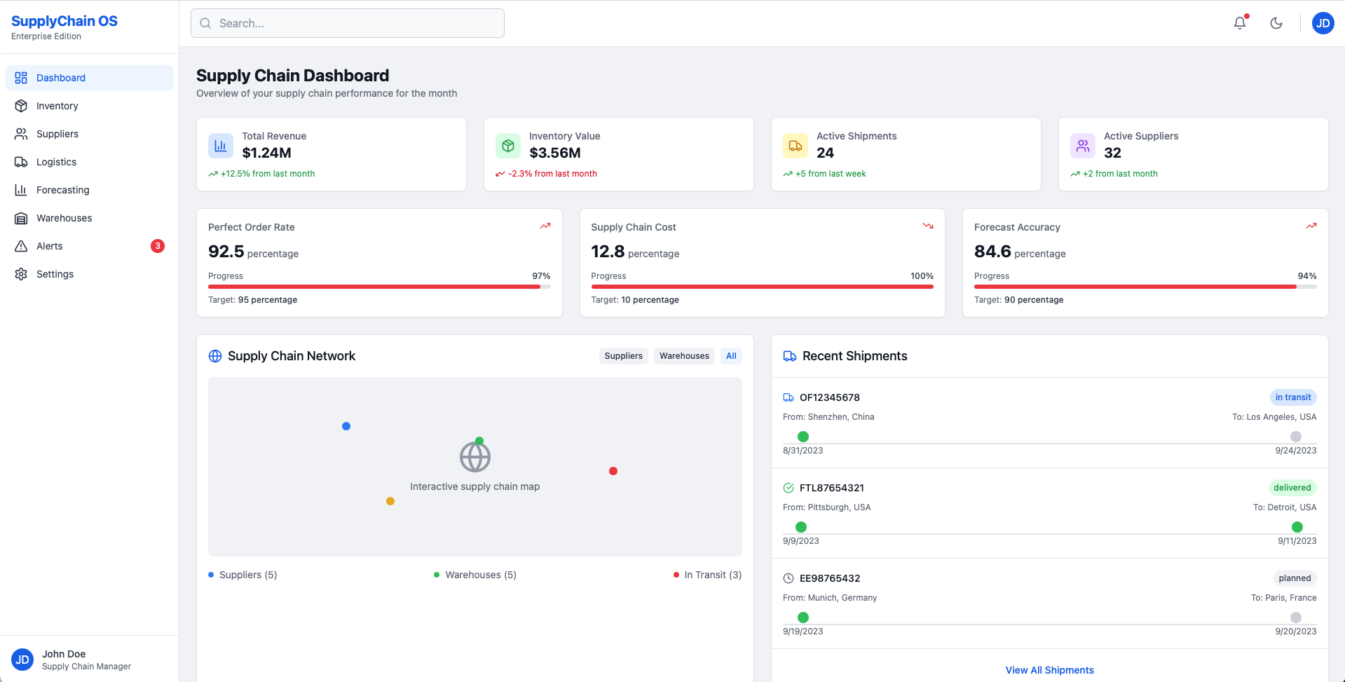 A comprehensive supply chain operations dashboard that manages inventory, supplier relationships, logistics tracking, and demand forecasting. The platform provides real-time KPI monitoring, warehouse management across multiple locations, and AI-powered demand prediction to optimize supply chain efficiency.