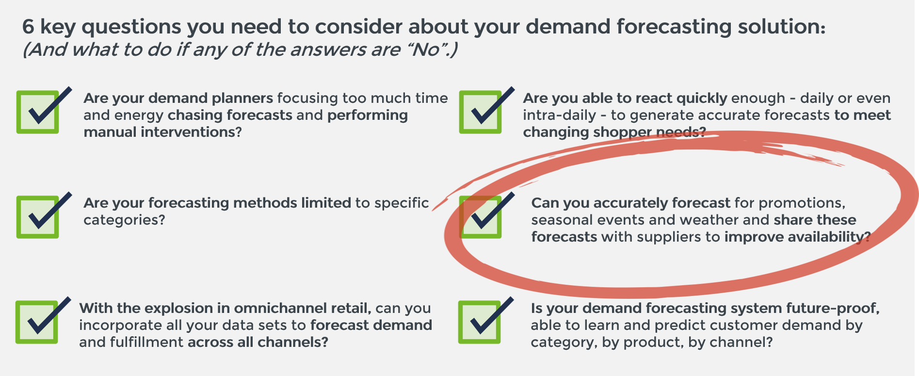 The Question: Can you accurately forecast for promotions, seasonal events and weather and share these forecasts with suppliers to improve availability?