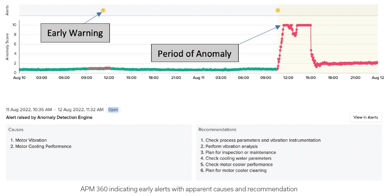 APM 360 was applied at this plant and real-time data from critical equipment was fed into it. APM 360 uses a blend of process data and asset vibration data to detect incipient anomalies and provide insights into them. It leverages IIOT, AI and FMEA that provide real-time anomaly detection with real-time, automated cause analysis and advisories. This ensures greater reliability, uptime, and peak asset performance due to its ability to predict into the future, analyze leading indicators, and provide causes and mitigation steps immediately.