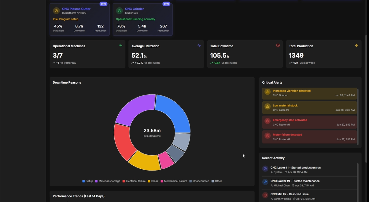 CNC machines are the lifeblood of manufacturing, yet downtime and visibility gaps persist. IRIS Foundry’s CNC monitoring solution leverages pre-built industrial protocol connectors (MTConnect, OPC UA, FOCAS, SINUMERIK) and cross-platform dashboards to deliver: